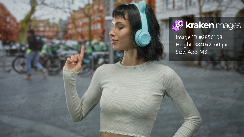 Young woman wearing blue cat ear headphones points finger at parked bicycles on urban street; confidence.