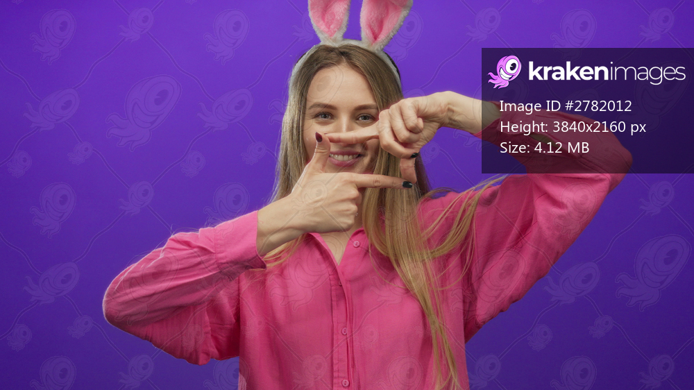 Young woman wearing bunny ears and pink shirt gestures framing face in front of isolated purple background with playful expression and long blonde hair - Kraken Images