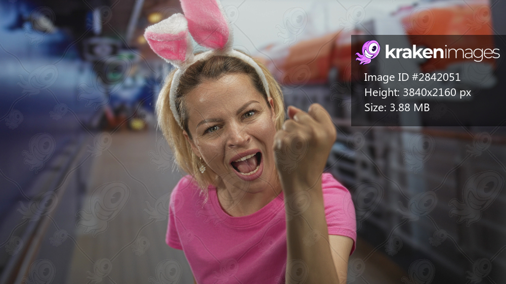 Young woman wearing bunny ears yelling and pumping her fist by cruise ship railing near building deck; excitement.