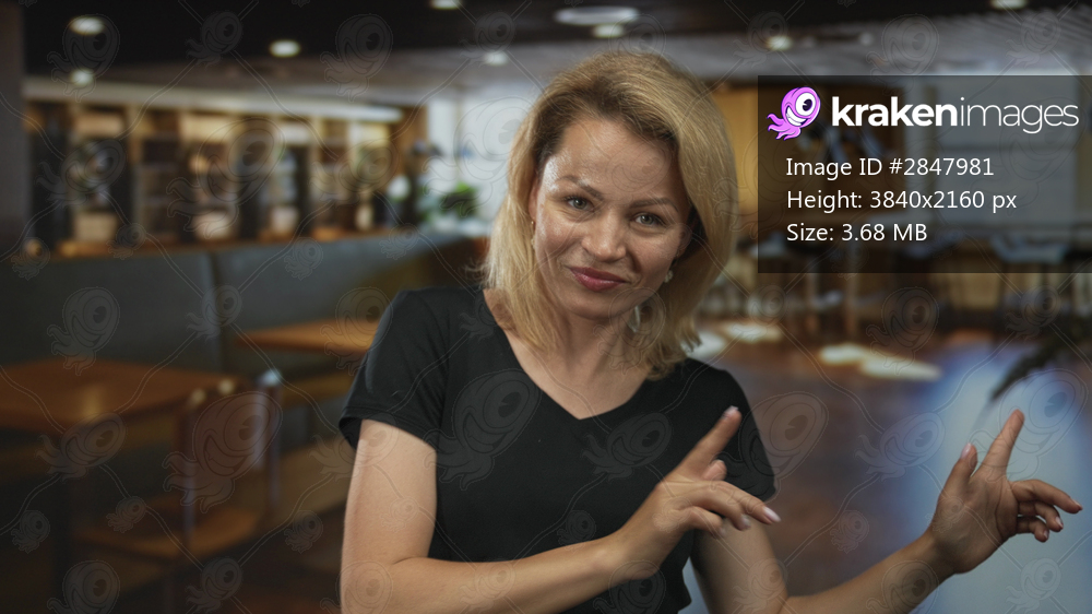 Young woman wearing casual black shirt smiling and pointing finger in building; dance celebration joyful.