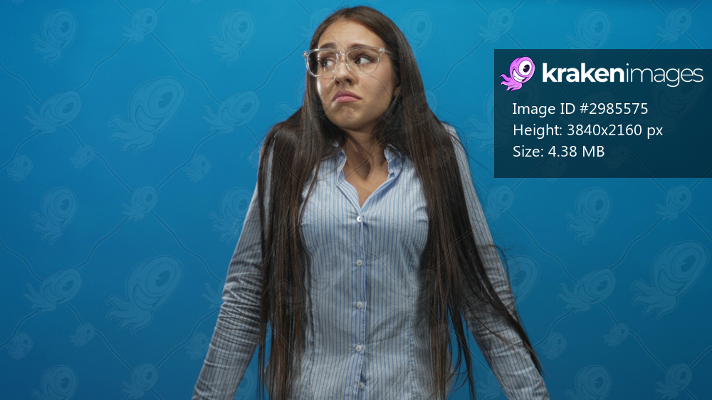 Young woman wearing clear glasses and striped shirt shrugs with raised shoulders in studio; uncertainty.