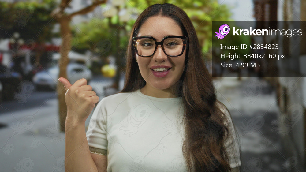 Young woman wearing eyeglasses and casual white top shows thumbs up gesture on sunny urban street lined with trees and blurred traffic; optimism.