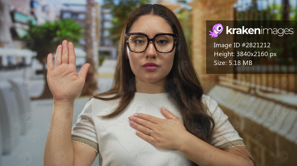 Young woman wearing eyeglasses raises hand and touches chest on sunlit bustling city street; sincerity.