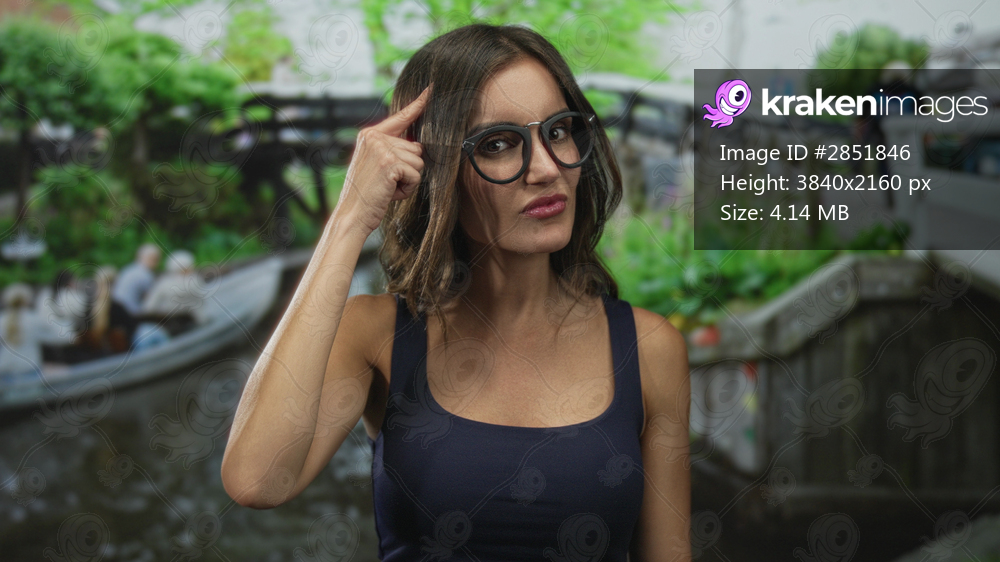 Young woman wearing glasses and a blue tank top raises finger near canal on street; curiosity discovery.
