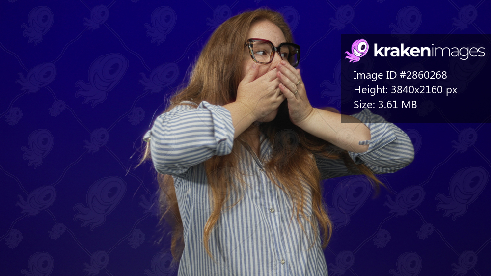 Young woman wearing glasses and a striped shirt covers mouth with hands in blue studio; astonishment.