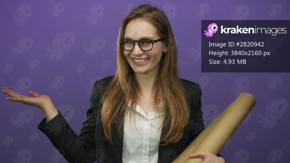 Young woman wearing glasses and blazer holding a cardboard tube and palm raised in a purple studio setting; optimism.