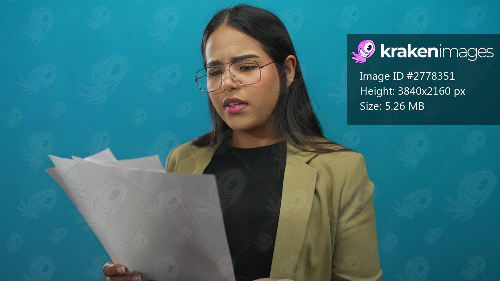 Young woman wearing glasses examines paperwork against a vivid blue background, conveying focus and concentration in a modern, isolated setting.