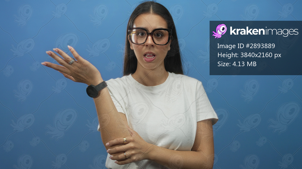 Young woman wearing glasses gesturing with hands in studio against blue backdrop with white t shirt visible; curiosity question communication.