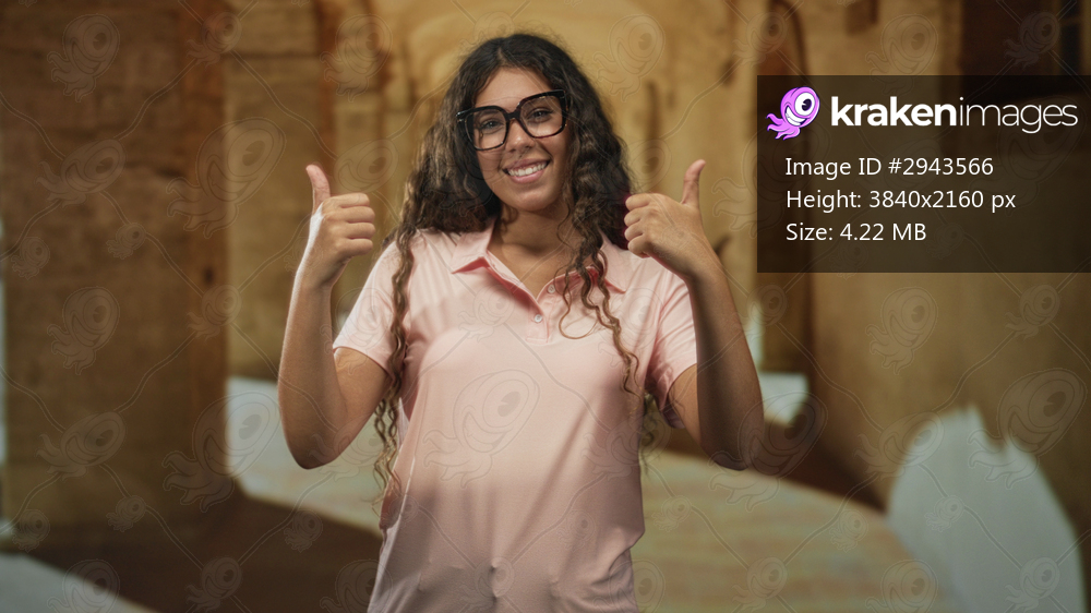 Young woman wearing glasses gives thumbs up gesture inside a sunlit arched stone building; confidence encouragement support.