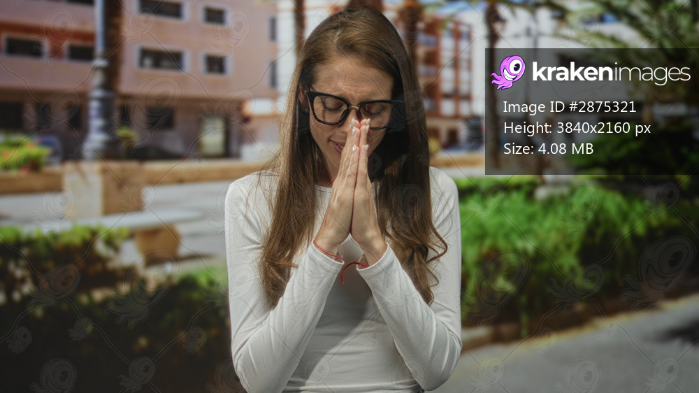 Young woman wearing glasses with hands clasped in prayer, head tilted up on a street; hope resilience reflection.