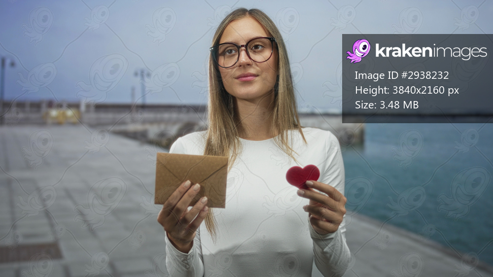 Young woman wearing glasses holding a kraft envelope and small red heart at a concrete pier by the sea, facing camera with gentle expression; hopeful.