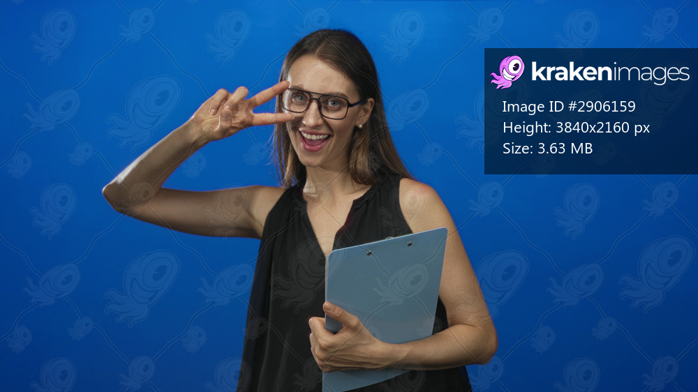Young woman wearing glasses holding clipboard making peace sign with fingers in blue studio; playful confidence.