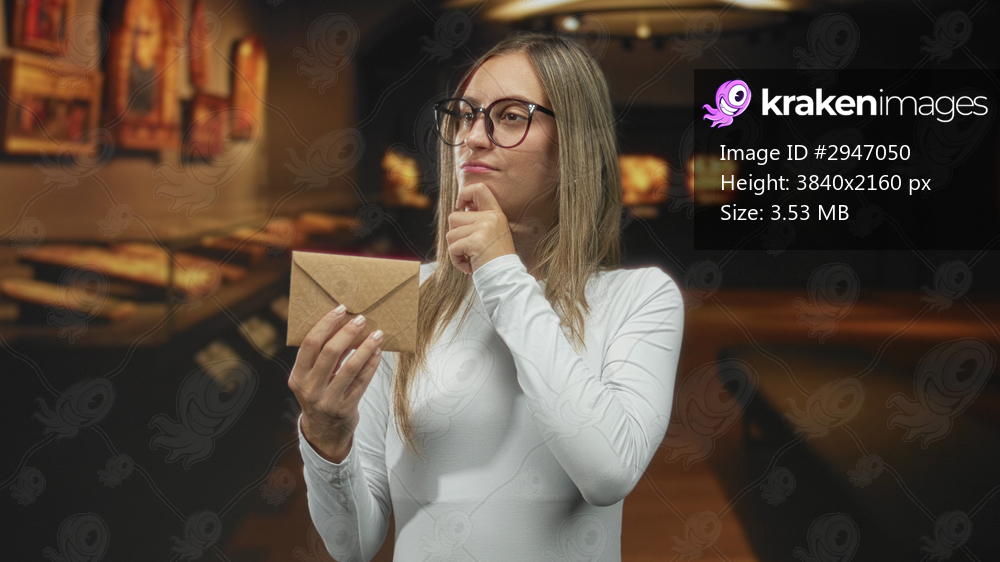 Young woman wearing glasses holds envelope, finger to chin while viewing exhibits in museum gallery; curiosity and mystery.