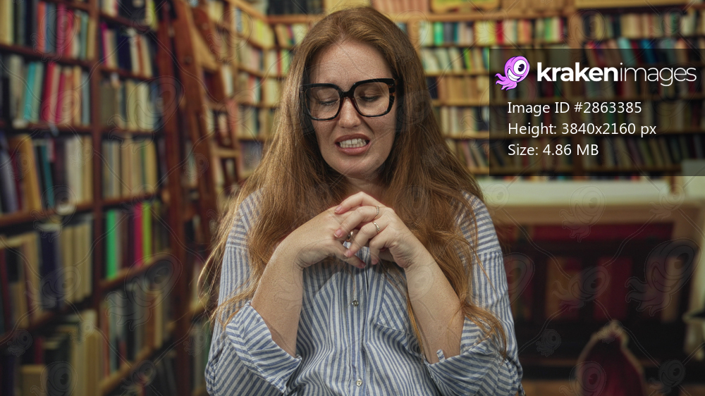 Young woman wearing glasses holds hands to cheeks in building at towering bookshelves; contemplation introspection.