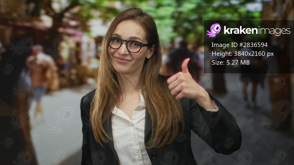 Young woman wearing glasses in black blazer and white shirt gives thumbs up on city street amid blurred crowd; approval.