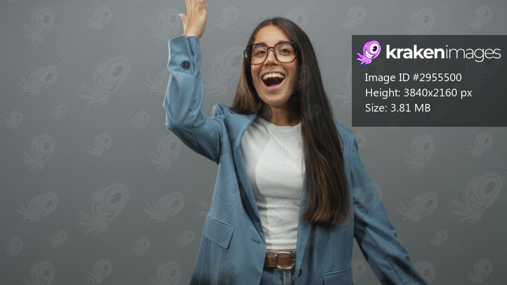 Young woman wearing glasses in blue blazer and white top, hand on forehead and arm raised, mouth open in surprised cheer against a gray backdrop in a studio; surprise celebration.