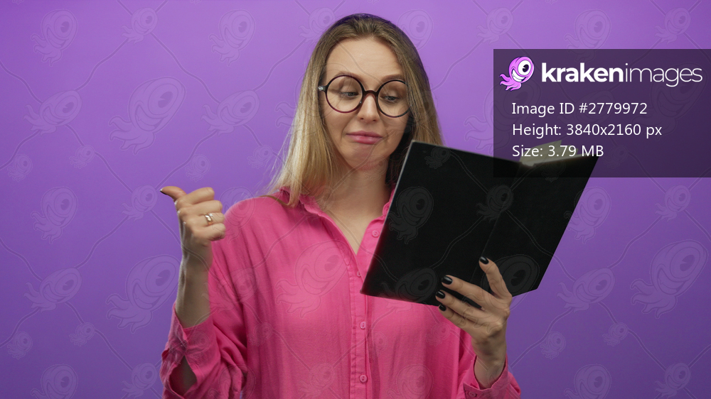 Young woman wearing glasses in pink shirt reads a book with a thoughtful expression against an isolated purple background.