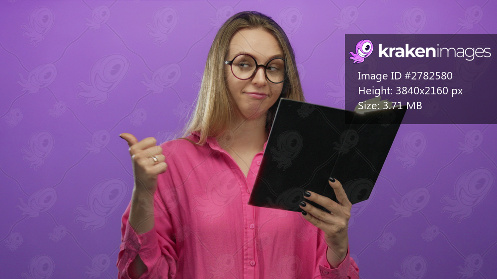 Young woman wearing glasses in pink shirt reads a book with a thoughtful expression against an isolated purple background.