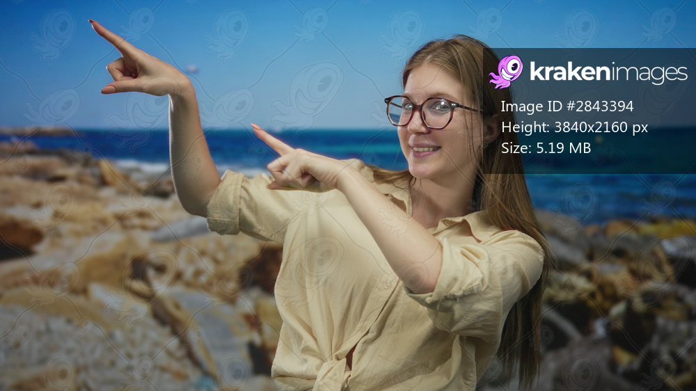 Young woman wearing glasses points finger to object on sunlit beach with rocky shoreline in bright daylight; highlight curiosity.