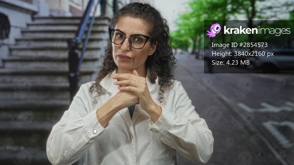Young woman wearing glasses punches palm with fist on city street; determination resilience confidence empowerment.