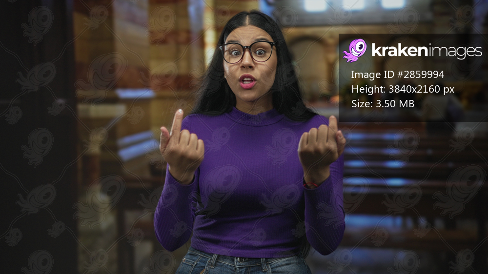 Young woman wearing glasses and purple sweater points finger to chest inside church building; surprise identity.