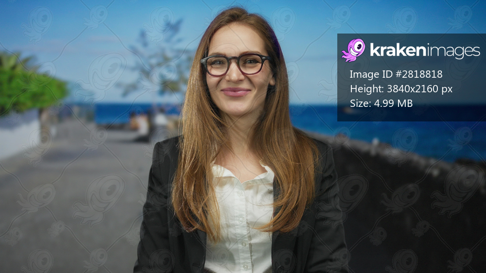Young woman wearing glasses smiles with visible mouth under sunlight on seaside promenade; happiness.