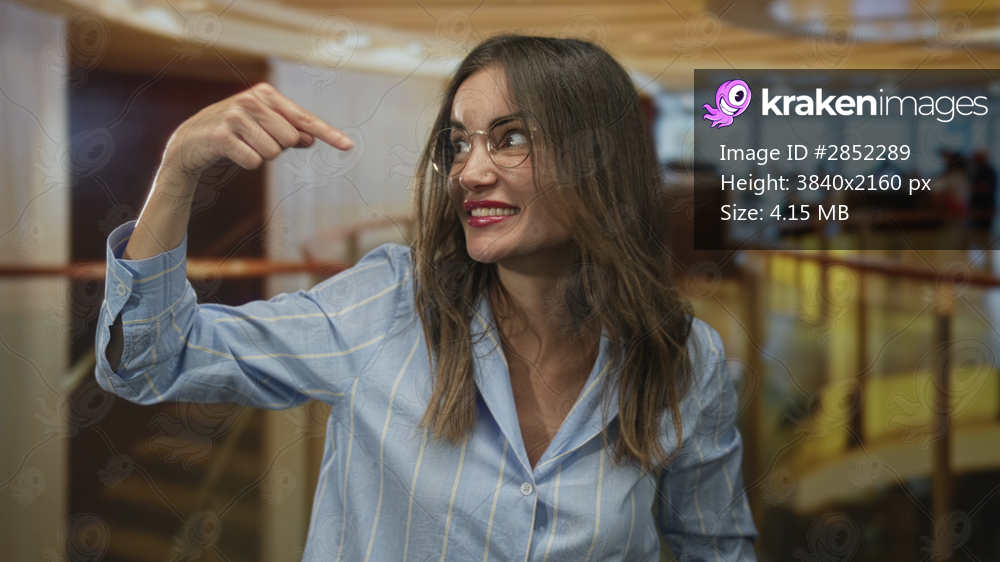 Young woman wearing glasses smiling and pointing finger at herself in hotel building; self confidence pride empowerment.