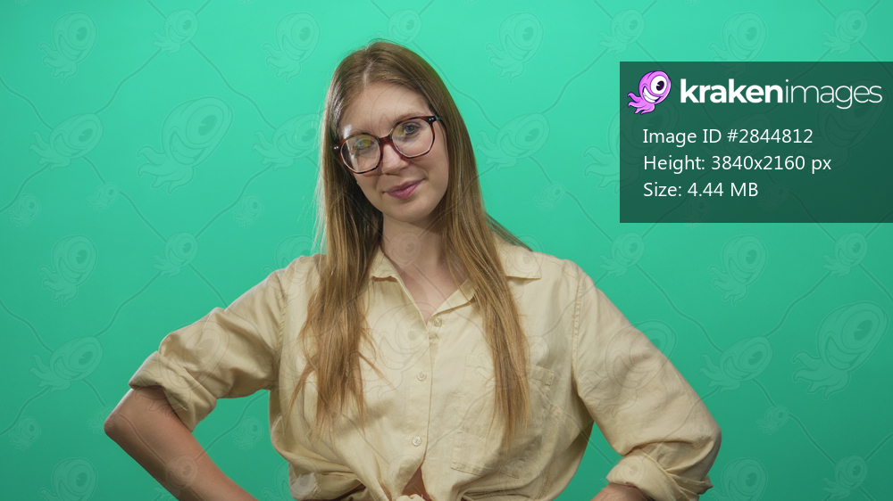 Young woman wearing glasses stands with hands on hips in green studio; confidence empowerment resilience.
