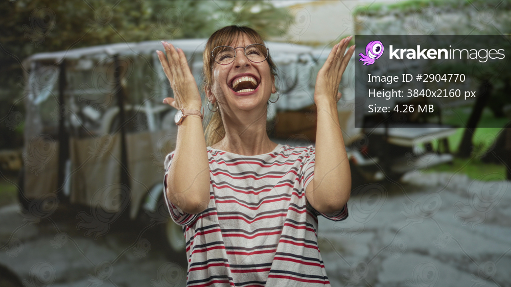 Young woman wearing glasses and striped shirt with hands on cheeks laughing on a street beside a covered golf cart and park trees; joy celebration.