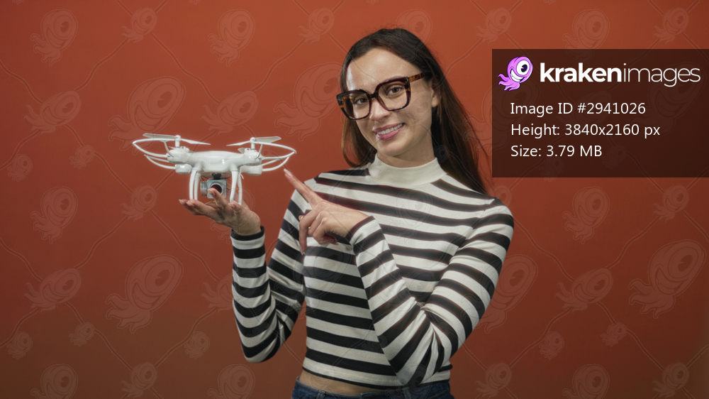 Young woman wearing glasses and striped top holding white drone on palm and pointing finger at it in studio; technology curiosity playful.
