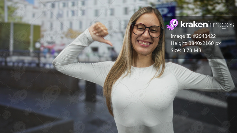 Young woman wearing glasses thumbs pointing to chest on a city street with building facade and parking sign; confidence celebration.
