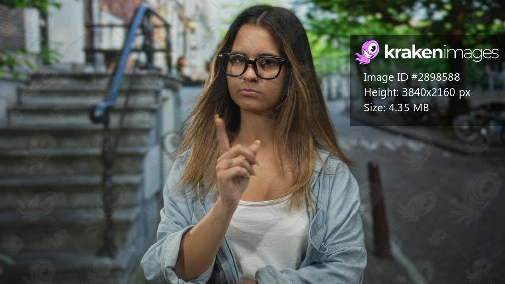 Young woman wearing glasses touching temple with hand beside stone stairs on city street; pensive reflection.