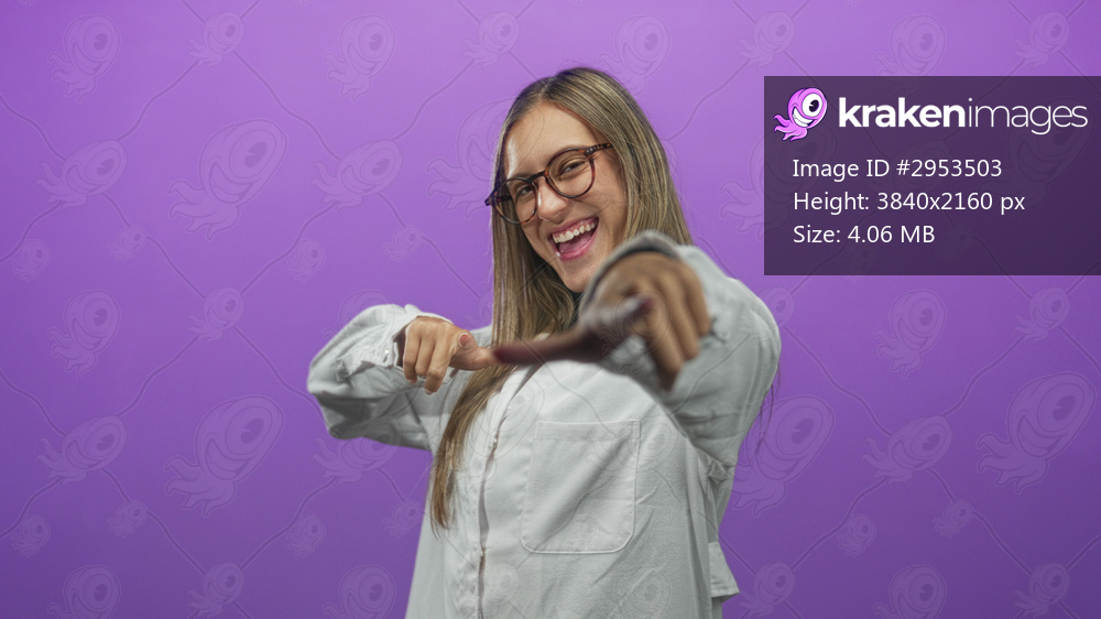 Young woman wearing glasses and white shirt points finger at camera while smiling in a purple studio; playful confidence.