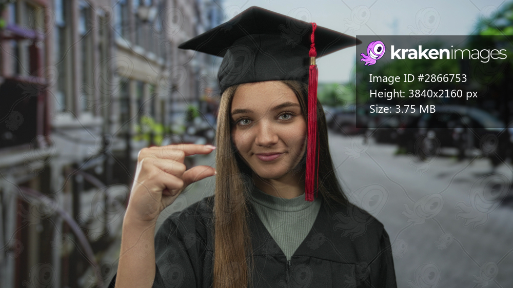 Young woman wearing graduation cap and gown pinches her fingers in front of blurred city street buildings and parked cars; pride.