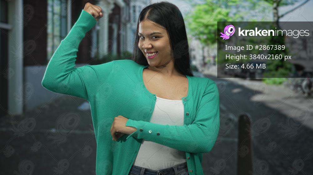 Young woman wearing green cardigan flexes bare arm in street next to building with a smile; confidence.