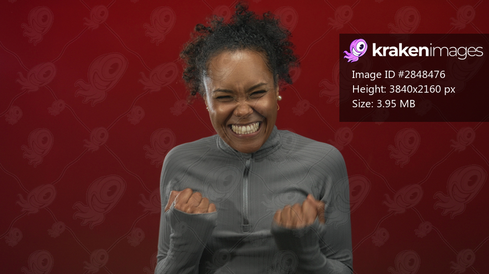 Young woman wearing grey pullover pumps fist and smiles with teeth visible in red studio setting; joy celebration triumph success.