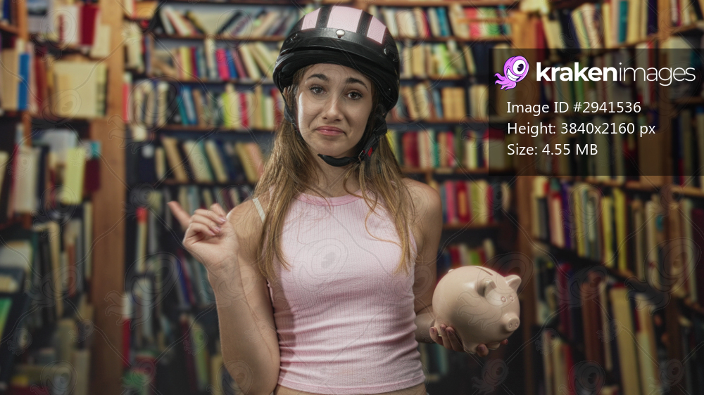 Young woman wearing helmet holds piggybank and points finger in a library building; playful thrift.