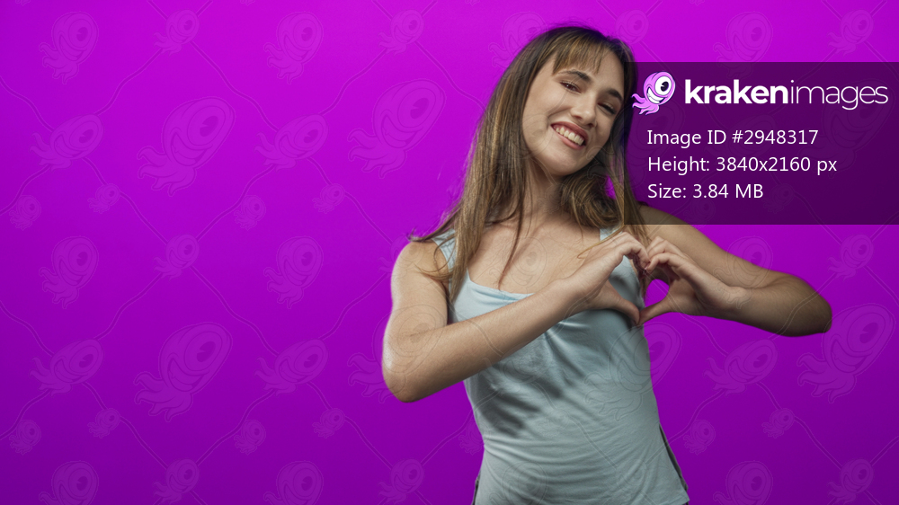 Young woman wearing light blue tank top forms heart with hands and smiles toward camera in purple studio; love warmth.