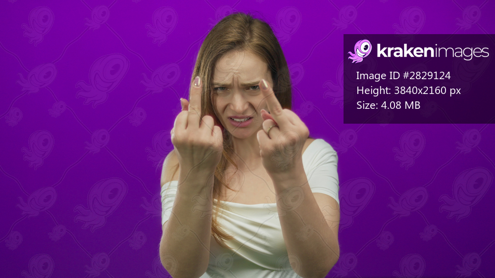 Young woman wearing off shoulder white top shows middle finger with furrowed brows in purple studio; anger defiance.