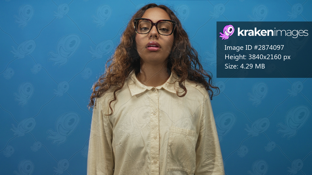 Young woman wearing oversized glasses with palms up in a shrug gesture in a blue studio setting, beige shirt visible; uncertainty pondering decision.