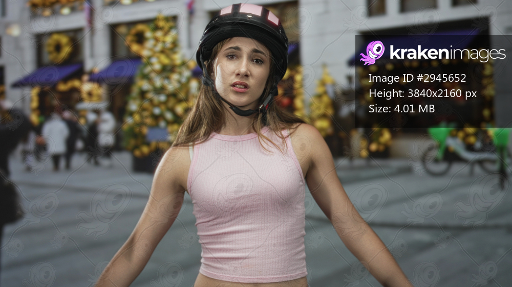 Young woman wearing pink helmet and cropped tank showing bare midriff, standing on a city street with holiday decorations and storefronts; uncertainty. - Kraken Images