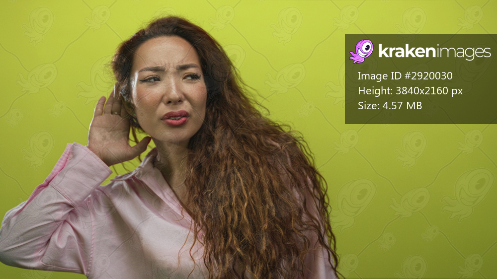 Young woman wearing pink shirt holding hand to ear and squinting in studio with lime green backdrop; concentration.