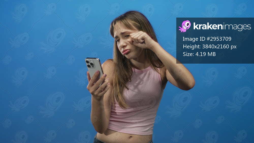 Young woman wearing pink tank top holding smartphone rubbing her eye in studio against blue wall; sadness.