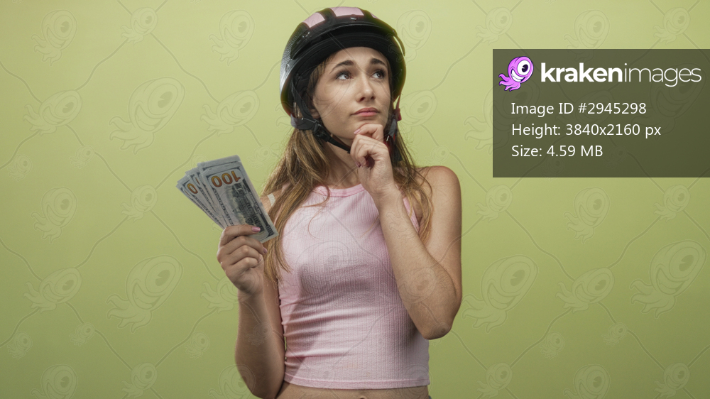 Young woman wearing pink tanktop and helmet holding us dollar bills with hand on chin in green studio; financial uncertainty.