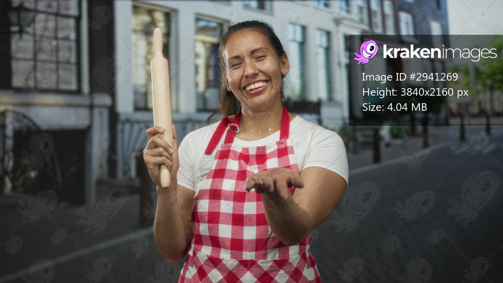 Young woman wearing red checkered apron holding a rolling pin and extending her hand on a city street lined with buildings; home cooking friendliness community. - Kraken Images