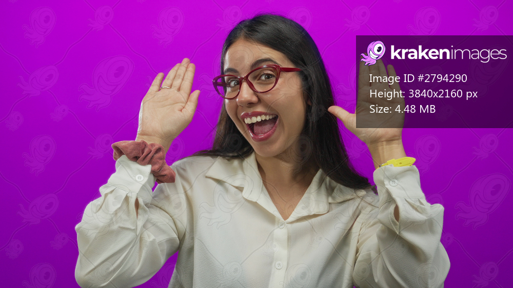 Young woman wearing red glasses and an elegant white blouse covers face with hands in a studio; playfulness.