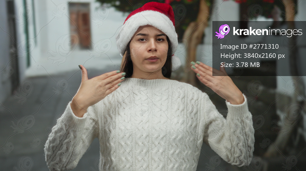 Young woman wearing santa hat cools herself while standing on an outdoor street, dressed in a cozy white sweater, reflecting festive yet fresh vibes with a hispanic cultural background. - Kraken Images