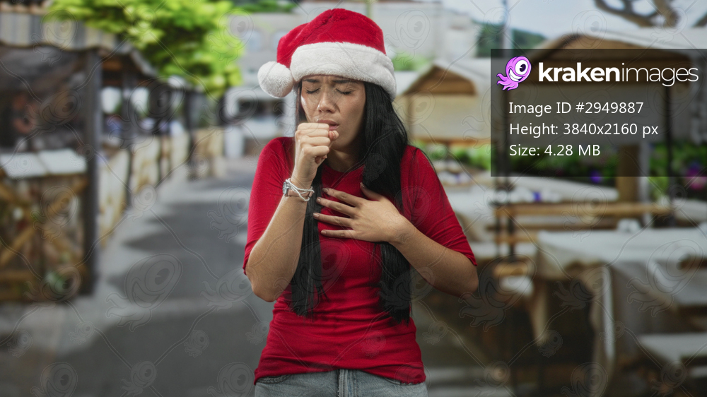 Young woman wearing santa hat coughs into fist and clutches chest amid street market stalls; discomfort.