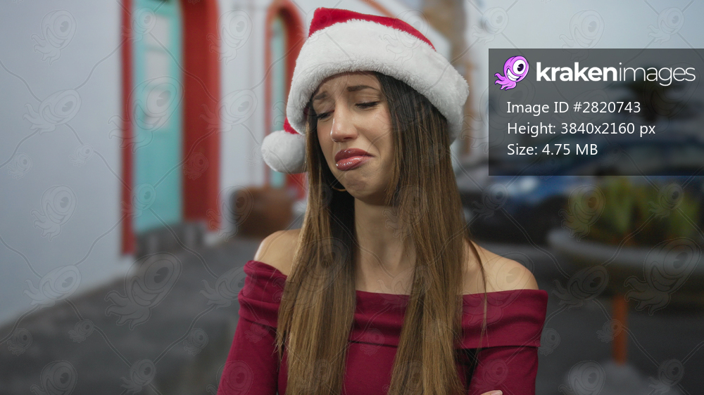 Young woman wearing santa hat crying with visible tears on a colorful city street adorned with christmas lights and decorations; holiday sorrow.