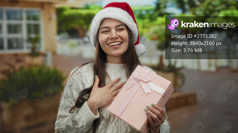 Young woman wearing santa hat holding pink gift outdoors with a joyful smile, surrounded by greenery and architecture.